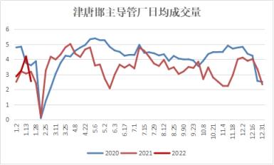 焊鍍管廠冬儲(chǔ)水平偏低。據(jù)網(wǎng)調(diào)研,截至1月21日,天津唐山邯鄲主流管廠廠內(nèi)總體庫(kù)存67.82萬(wàn)噸,比上月同期降1.45萬(wàn)噸,下降2.09%;比去年農(nóng)歷同期降11.63萬(wàn)噸,下降14.64%。廠內(nèi)原料帶鋼庫(kù)存24.55萬(wàn)噸,比上月同期降7.11萬(wàn)噸,比去年農(nóng)歷同期降7.32萬(wàn)噸;焊管庫(kù)存15.47萬(wàn)噸,比上月同期增0.31萬(wàn)噸,比去年農(nóng)歷同期降1.84萬(wàn)噸;鍍鋅管庫(kù)存27.8萬(wàn)噸,比上月同期增5.35萬(wàn)噸,比去年農(nóng)歷同期降2.47萬(wàn)噸。1月中旬左右因冬奧會(huì)管控供應(yīng)階段偏緊預(yù)期出現(xiàn),但市場(chǎng)普遍對(duì)2月行情回暖高度及周期看法謹(jǐn)慎,加工類(lèi)及協(xié)議貿(mào)易商多理性冬儲(chǔ),整體庫(kù)存控制在15-20天銷(xiāo)量左右,部分地區(qū)受工程回款及疫情影響較大,庫(kù)存偏低。1月20-25日北方管廠陸續(xù)停產(chǎn)放假,在產(chǎn)產(chǎn)能利用率下降至62.55%;南方部分管廠接年后訂單幾千噸至萬(wàn)噸左右,產(chǎn)線(xiàn)在28日-29日左右停工,原料儲(chǔ)備至2月用量(見(jiàn)圖4)。