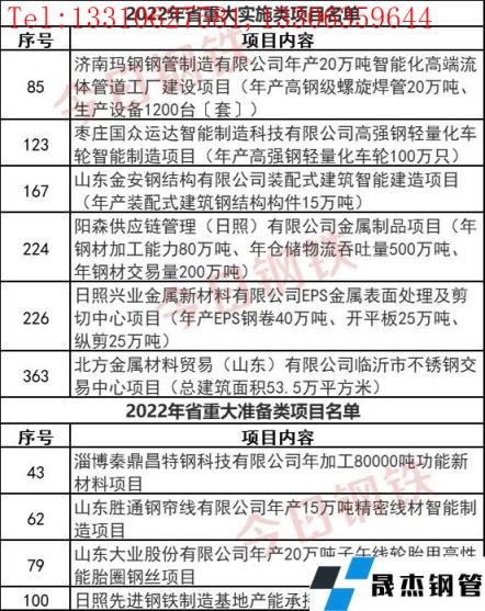 2022年1月20日,山東省人民政府發布《關于下達2022年省重大項目名單的通知》。此次通知中公布的600個項目中,涉及重大實施類項目449項,重大準備類項目151項。其中涉及到日照先進鋼鐵制造基地產能承接一期項目、濟南瑪鋼厚壁無縫鋼管制造有限公司年產20萬噸智能化高端流體管道工廠建設項目等10個鋼鐵相關項目。