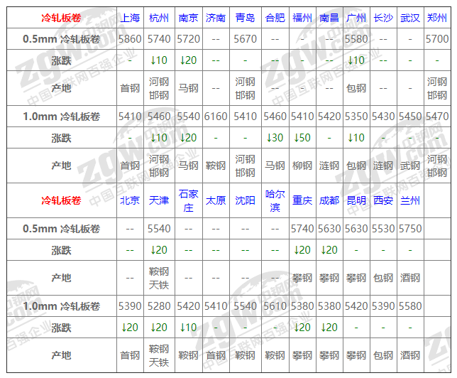 全國23個主要市場1.0mm 冷軋板卷平均價格5468元/噸,較上個交易日下調(diào)8元/噸。