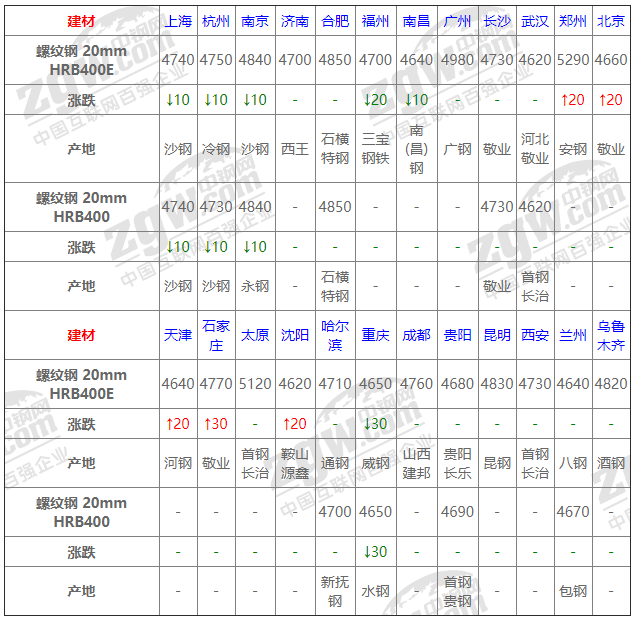 全國24個主要市場螺紋鋼 20mm HRB400E平均價格4770元/噸,較上個交易日上調(diào)2元/噸。