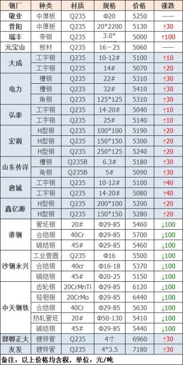 今日無縫鋼管廠家指導價格以漲為主,部分補跌。今日黑色系期貨持續上行,成本大幅上漲,市場心態有所提振,廠家跟漲心態明顯,下游操作多按需補庫,部分廠商出貨向好,但整體交投一般,預計短期無縫鋼管廠家價格穩中偏強。