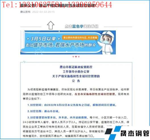 免責聲明:本網站(山東聊城晟杰無縫鋼管廠www.ginginbaby.com)刊載的“突發!唐山全域性封控,鋼市影響升級”等均源于網絡,版權歸原作者所有,且僅代表原作者觀點,本文所載信息僅供參考。轉載僅為學習與交流之目的,如無意中侵犯您的合法權益,請及時聯系刪除。本網站刊登此篇文章并不意味著本站贊同其觀點或證實其內容的真實性,我們不對其科學性、嚴肅性等作任何形式的保證。如果侵犯了您的版權,請盡快聯系我們予以撤銷,謝謝合作!