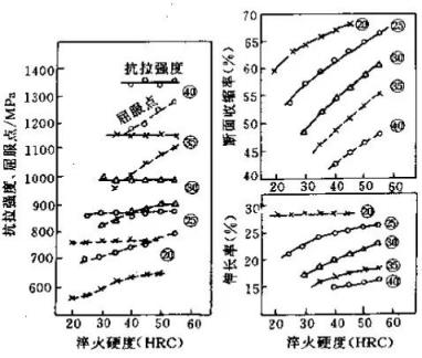 40Cr鋼經(jīng)過830℃加熱在不同淬火冷卻速度下獲得不同層淬火硬度后,通過不同的淬火溫度,回火得到不同的回火硬度,然后進行拉伸試驗。結(jié)果表明,抗拉強度取決于最后回火硬度,幾乎不受淬火硬度的影響;而屈服度強度、伸長率和斷面收縮率不僅取決于回火硬度,也與淬火硬度有很大關(guān)系,在回火得到相同硬度的條件下,這些性能指標隨淬火硬度的升高而提高。因此,淬火回火工件不能只控制其回火后的硬度,還應(yīng)檢驗淬火后的硬度,以便檢查工件淬火是否充分,不充分的淬火,在大多數(shù)時候應(yīng)作為熱處理缺陷重新返工處理。