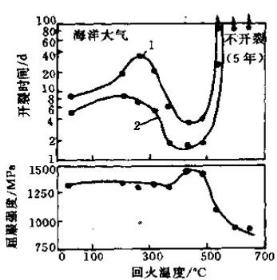 ▲圖10回火溫度對Cr12型不銹鋼屈服強度和應(yīng)力腐蝕開裂行為的影響1-外加應(yīng)力為50%σ0.22-外加應(yīng)力為75%σ0.2
