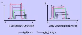 ④ 軋制力曲線(xiàn)臺(tái)階。例如:由于1架輥速過(guò)高、輥縫過(guò)大,2架輥速過(guò)低、輥縫過(guò)小而引起的變形制度不匹配,軋制力曲線(xiàn)異常(如下圖)。