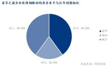 根據(jù)調(diào)研,春節(jié)之前企業(yè)優(yōu)特鋼棒材的庫(kù)存水平與往年同期相比近40%同比持平,40%無(wú)縫鋼管廠庫(kù)存同比下降,僅少數(shù)庫(kù)存有增加。預(yù)計(jì)春節(jié)后庫(kù)存累計(jì)情況與往年相比,四成為持平,四成為減少,兩成為增加。主要原因是目前來(lái)看,庫(kù)存的減少,導(dǎo)致資源的緊缺,貿(mào)易商會(huì)向廠家拿貨,無(wú)縫鋼管廠降庫(kù)會(huì)加快。