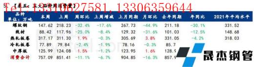 據統計,本周五大品種周消費量除熱軋板卷和中厚板,其余品種均有下降,合計周消費降至757.09萬噸,環比減少94.32萬噸,降幅11.1%;上周五大品種周合計消費851.41萬噸,環比減少61.52萬噸,降幅6.7%。從目前五大品種周消費來看,春節臨近,休市在即,需求基本停滯,周消費量預期內下降。
