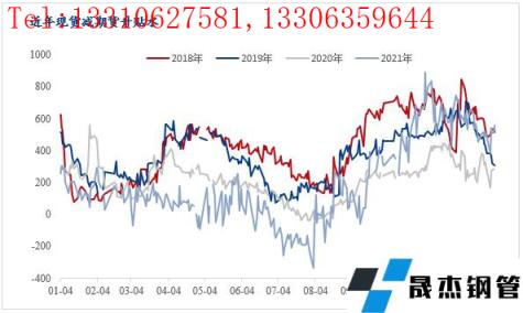 由圖所示,為2018年至2021年,省內南京市場現貨價格與期貨螺紋鋼價格之差。各年均值分別為417.38元/噸、361.51元/噸、213.99元/噸、195.69元/噸。可以發現去年有兩個很鮮明的特點:1、期貨市場預期最好,雖然絕對價格處于歷年最高區間,但是期貨貼水反而是近年最低的;2、7、8月份期貨預期很飽滿,達到歷史最低現期差,以南京市場為例,現貨價格一度低于期貨337元/噸,這是非常罕見的,也給市場很好的期現套利的機會。由圖所示,現期差從-337拉至890,單邊幅度高達1227元/噸。