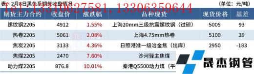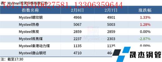 ◎ 2月8日下午,對山東、山西、河南三省43家無縫厚壁鋼管廠家限產(chǎn)狀態(tài)進(jìn)行更新,涉及生鐵年產(chǎn)能1.58億。據(jù)調(diào)研了解,目前43家無縫厚壁鋼管廠家高爐產(chǎn)能利用率為75.31%,日均生鐵產(chǎn)量33萬噸。為保證冬奧會期間北京的空氣質(zhì)量,預(yù)計未來三天內(nèi)區(qū)域內(nèi)將有11家無縫厚壁鋼管廠家的的燒結(jié)、高爐生產(chǎn)有所調(diào)整,調(diào)整期間影響日均鐵水產(chǎn)量4.56萬噸/日。