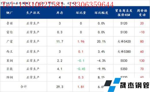2月14日山東優(yōu)特無縫厚壁鋼管廠家棒材總庫存29.3萬噸,環(huán)比增加1.81萬噸,增幅6.58%,較去年春節(jié)后第二周庫存增加4.1萬噸。