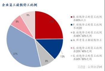 調(diào)研企業(yè)樣本中,放假停工的員工比例在20%~40%之間占比7.76%,放假停工的員工比例在40%~60%之間占比 8.65%;放假停工的員工比例在60%~80%之間占比8.65%;放假停工的員工比例不到20%占比12.86%;放假停工的員工比例在80%以上占比24.83%;所有員工都放假停工占比37.25%。
