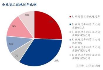 調(diào)研企業(yè)樣本中,所有員工都就地過年占比25.50%,就地過年的員工比例在80%以上占比33.70%,就地過年的員工比例在60%~80%之間占比13.75%,就地過年的員工比例在40%~60%之間占比9.76%,就地過年的員工比例在20%~40%之間占比7.10%,就地過年的員工比例不到20%占比10.20%。