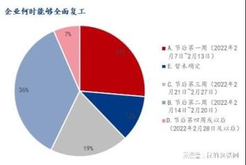 調(diào)研企業(yè)樣本中,對于全面復(fù)工的時間,節(jié)后第一周(2022年2月7日~2月13日)占比26.37%,節(jié)后第二周(2022年2月14日~2月20日)占比36.32%,節(jié)后第三周(2022年2月21日~2月27日)占比19.40%,節(jié)后第四周或以后(2022年2月28日及以后)占比6.47%,暫未確定占比11.44%。