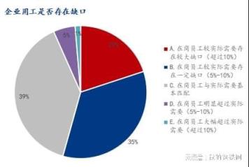 3、對比實際經(jīng)營需要,54.32%企業(yè)表示在崗員工比實際需要存在缺口,39.02%企業(yè)表示在崗員工與實際需要基本匹配,僅有6.65%在崗員工超過實際需要。