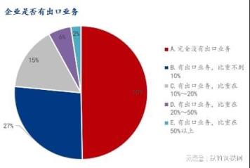 參與調(diào)研企業(yè)中,49.67%企業(yè)表示完全沒有出口業(yè)務(wù),50.33%企業(yè)有出口業(yè)務(wù),具體看有出口業(yè)務(wù),比重不到10%占比26.83%;有出口業(yè)務(wù),比重在10%~20%占比15.52%;有出口業(yè)務(wù),比重在20%~50%占比5.54%;有出口業(yè)務(wù),比重在50%以上占比2.44%。