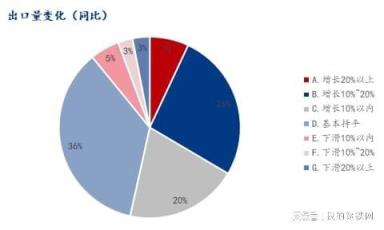 與去年同期相比,關(guān)于今年的出口量變化,在有出口業(yè)務(wù)的樣本中53.48%企業(yè)表示出口有增長,35.65%企業(yè)表示基本持平,10.87%企業(yè)出口下滑。具體來看增長20%以上占比6.96%,增長10%~20%占比26.52%,增長10%以內(nèi)占比20.00%,基本持平占比35.65%,下滑10%以內(nèi)占比5.22%,下滑10%~20%占比2.61%,下滑20%以上占比3.04%。
