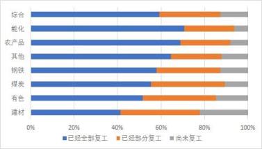 從未復(fù)工的企業(yè)調(diào)研情況來看,截至2月11日,計劃在2月7日-13日(節(jié)后第一周)復(fù)工的企業(yè)占比11.5%,計劃在2月14日-29日(節(jié)后第二周)復(fù)工的企業(yè)占比17.6%。預(yù)計節(jié)后兩周內(nèi),超九成企業(yè)都將完成復(fù)工,鋼鐵、能化、農(nóng)產(chǎn)品行業(yè)企業(yè)復(fù)工率預(yù)計達到93%以上。