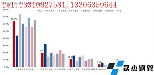 本地調(diào)研,我們還就企業(yè)是否有出口業(yè)務(wù)、出口業(yè)務(wù)比重有進行了調(diào)研。 調(diào)研顯示,完全沒有出口業(yè)務(wù)的企業(yè)占比63.99%,有出口業(yè)務(wù),比重不到10%的企業(yè)占比19.82%,有出口業(yè)務(wù),比重在10%~20%的企業(yè)占比10.91%,有出口業(yè)務(wù),比重在20%~50%的企業(yè)占比3.68%,有出口業(yè)務(wù),比重在50%以上的占比只有1.60%。分行業(yè)來看,幾乎所有行業(yè)出口占比都比較低,其中生產(chǎn)企業(yè)整體要高于其他行業(yè)。