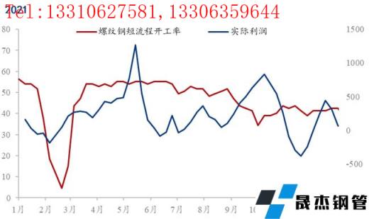 而對(duì)于2021年的數(shù)據(jù)來(lái)說(shuō)無(wú)論是相關(guān)分析還是回歸分析結(jié)果表現(xiàn)出與其他年份有不同的結(jié)果,這與2021年的特殊情況有關(guān)。由于2021年螺紋鋼價(jià)格的急劇變化,導(dǎo)致電弧爐實(shí)際利潤(rùn)具有了極強(qiáng)的波動(dòng)性,而且由于能耗雙控,從8月底電弧爐無(wú)縫厚壁鋼管廠家被嚴(yán)格限產(chǎn),導(dǎo)致了電弧爐開(kāi)工率有近20%左右的持續(xù)下降,創(chuàng)造了歷史低位,政策以及成材價(jià)格變動(dòng)明顯干擾了數(shù)據(jù)的觀測(cè),如下圖所示: