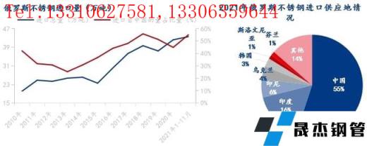 在需求增長帶動下,近年來俄羅斯不銹鋼進口量大幅提升,2021年1-11月進口量累計約43.57萬噸,其中中國進口占比約55%。