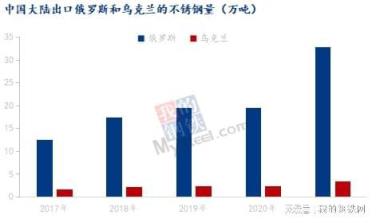 從中國海關數據了解到,中國大陸出口俄羅斯和烏克蘭的不銹鋼量呈上漲趨勢,2021年出口至俄羅斯的量約32.77萬噸(約為中國大陸出口總量的7.3%),同比增加68.3%;出口烏克蘭的量約3.46萬噸(約為中國大陸出口總量的0.8%),同比增加44.9%。