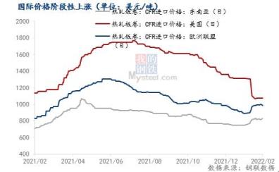 國際鋼價自俄烏沖突以來迎來了階段性上漲。截至2月28日,歐盟及東南亞進口CFR價格月環比分別上漲100美元/噸和82美元/噸;同時,美國進口價格也在2月中下旬停止了下跌趨勢開始企穩。