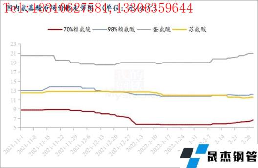 整體看來,俄烏對于中國來說并不是主要的出口國,俄烏局勢對于氨基酸市場而言影響較小。近期氨基酸市場價格整體上漲的原因多是玉米原料價格上漲及豆粕持續(xù)高位提振,疊加國內(nèi)下游企業(yè)恐慌情緒蔓延。短期內(nèi)氨基酸市場依舊維持偏強(qiáng)震蕩局面,持續(xù)關(guān)注玉米及豆粕的行情變化。