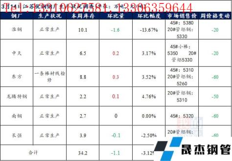 江蘇優特無縫厚壁鋼管廠家棒材總庫存34.2萬噸,較上周下降1.1萬噸,環比降3.12%,較去年同期下降7.97萬噸,同比降18.9%,目前江蘇優特無縫厚壁鋼管廠家除東方特鋼一條棒材線檢修外,其余無縫厚壁鋼管廠家正常生產。