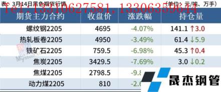 熱軋板卷:3月14日,全國24個(gè)主要城市4.75mm熱軋板卷均價(jià)5118元/噸,較上個(gè)交易日下跌53元/噸。黑色商品期貨市場大幅下挫,下游采購量觀望,商家心態(tài)悲觀,全天成交清淡。綜合來看,當(dāng)前疫情呈現(xiàn)復(fù)發(fā),剛需釋放有限,商家預(yù)期迷茫。短期鋼價(jià)震蕩運(yùn)行,既因?yàn)榍榫w受到期貨市場的引導(dǎo),又因?yàn)樾枨鬀]有放量的跡象,而無縫厚壁鋼管廠家起到"托舉"的作用。綜合來看,預(yù)計(jì)15日熱軋板卷價(jià)格或震蕩下行為主。