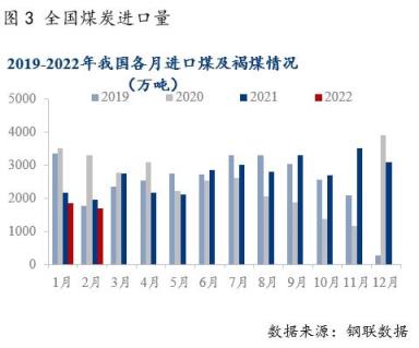 1-2月我國進(jìn)口煤同環(huán)比大幅下降。2022年1-2月進(jìn)口煤炭3539萬噸,同比下降14.0%,降幅比上年12月份收窄6.9個(gè)百分點(diǎn)。主要是受印尼1月煤炭禁止出口政策影響,影響1月下旬以及2月中上旬我國煤炭進(jìn)口到港,疫情影響我國288口岸蒙煤通關(guān)量下降至100車左右,導(dǎo)致1-2月我國煤炭進(jìn)口量同比大幅回落。2月下旬海外地緣沖突爆發(fā),短期對我國進(jìn)口有一定影響,對2月影響體現(xiàn)不大。