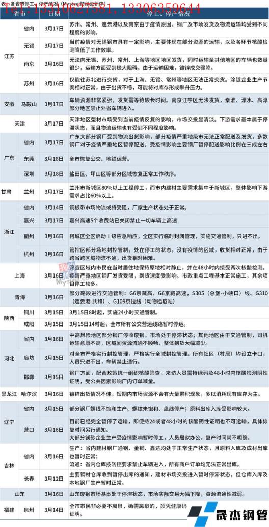 截至3月18日,匯總了15個省份停工停產最新信息。其中,江蘇省內蘇州、常州、連云港以及南京由于疫情原因,無縫厚壁鋼管廠家及市場發(fā)貨及物流運輸均受到不同程度的影響。安徽省內出現車輛資源非常緊張,發(fā)貨需等待較長時間等情況,無法向南京江寧區(qū)發(fā)貨,秦淮、溧水、高淳部分地區(qū)禁止外省車輛進入。廣東省大部分無縫厚壁鋼管廠家受到物流出貨影響,部分疫情嚴重地級市無法正常配送及發(fā)貨,多數無縫厚壁鋼管廠家對于疫情嚴重地區(qū)暫停配送。受疫情影響主要無縫厚壁鋼管廠家暫停配送影響比例在三成左右;東莞全市恢復公交、地鐵運營;深圳鹽田區(qū)、坪山區(qū)等部分區(qū)域恢復正常工作秩序。具體情況如下: