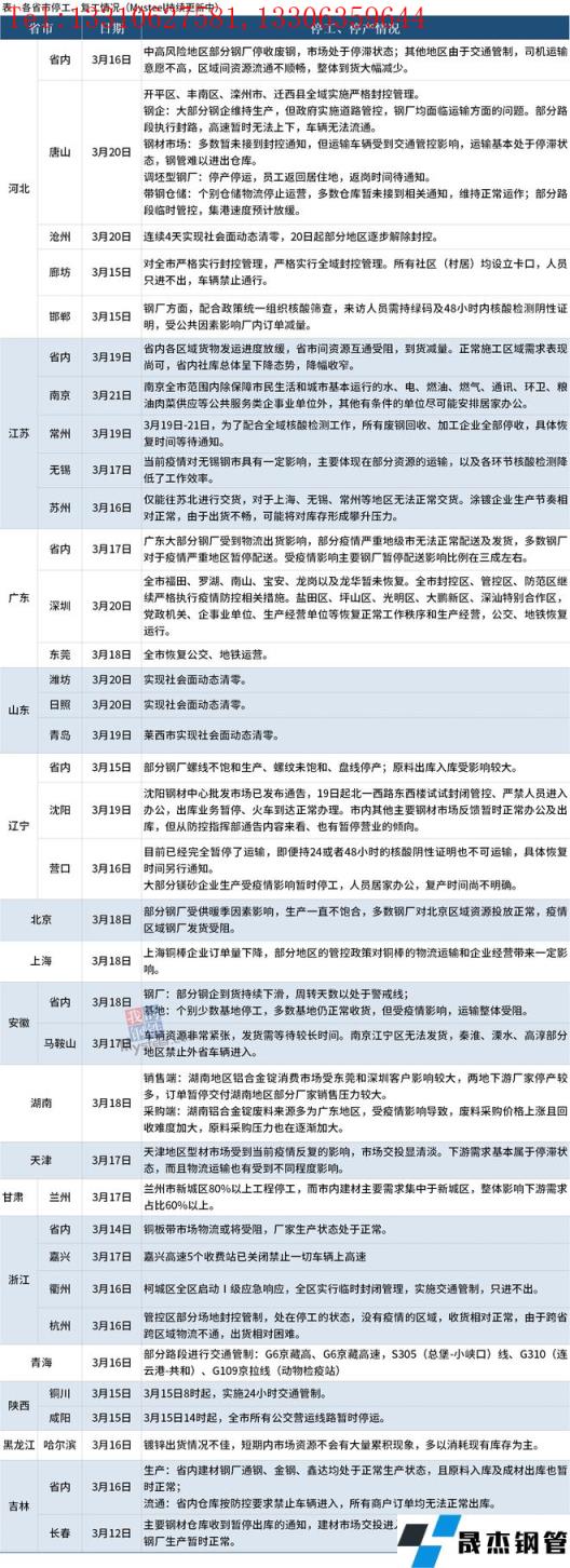 截至3月21日,匯總了16個省份停工停產(chǎn)最新信息。其中,3月21日,南京全市范圍內(nèi)除保障市民生活和城市基本運行的水、電、燃油、燃氣、通訊、環(huán)衛(wèi)、糧油肉菜供應等公共服務類企事業(yè)單位外,其他有條件的單位盡可能安排居家辦公。3 月20日,唐山開平區(qū)、豐南區(qū)、灤州市、遷西縣全域實施嚴格封控管理;大部分鋼企維持生產(chǎn),但政府實施道路管控,無縫厚壁鋼管廠家均面臨運輸方面的問題。深圳全市福田、羅湖、南山、寶安、龍崗以及龍華暫未恢復,全市封控區(qū)、管控區(qū)、防范區(qū)繼續(xù)嚴格執(zhí)行疫情防控相關措施。山東濰坊日照、青島萊西市實現(xiàn)社會面動態(tài)清零。河北滄州連續(xù)4天實現(xiàn)社會面動態(tài)清零,3月20日起部分地區(qū)逐步解除封控。具體情況如下: