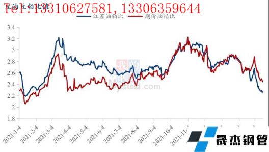 其六:3月份以來豆油價格見高回落,豆粕價格被動變得更加堅挺。3月初,豆粕期現(xiàn)貨價格雙雙創(chuàng)出階段性高位后出現(xiàn)一輪回撤走勢。從下圖油粕比走勢來看,2022年3月3日,江蘇地區(qū)現(xiàn)貨豆油豆粕比值2.68,期價主力合約豆油豆粕比值2.88;截止3月18日,江蘇地區(qū)現(xiàn)貨豆油豆粕比值下降至2.27,期價主力合約豆油豆粕比值下降至2.44。期間外圍CBOT大豆價格整體高位盤整為主,因此豆粕估值獲得被動提升。