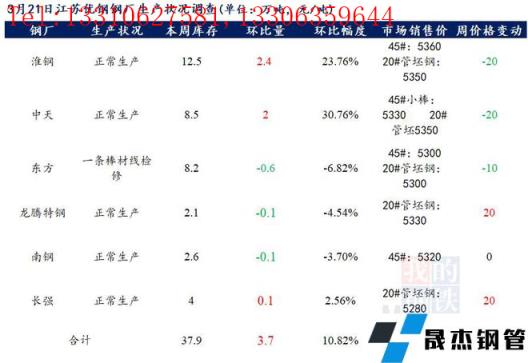 江蘇優特無縫厚壁鋼管廠家棒材總庫存37.9萬噸,較上周上升3.7萬噸,環比增10.82%,較去年同期下降5.56萬噸,同比降12.79%,目前江蘇優特無縫厚壁鋼管廠家除東方特鋼一條棒材線檢修外,其余無縫厚壁鋼管廠家正常生產。