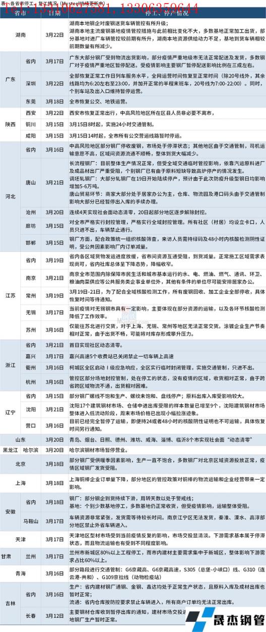 截至3月22日,匯總了16個(gè)省份停工復(fù)工最新信息。其中,湖南省本地鋼企對(duì)廢鋼送貨車輛管控有所升級(jí);主流廢鋼基地疫情管控措施與此前相比變化不大,多數(shù)基地正常加工出貨,部分基地對(duì)進(jìn)廠車輛管控較前期有所升。唐山長(zhǎng)流程無縫厚壁鋼管廠家目前整體生產(chǎn)情況正常,但受全域交通臨時(shí)管控影響,依靠汽運(yùn)原料進(jìn)廠及成品材出廠嚴(yán)重受阻,個(gè)別無縫厚壁鋼管廠家已有由于原料短缺導(dǎo)致高爐停產(chǎn)的情況發(fā)生。山東省已有青島、煙臺(tái)、日照、德州、濰坊、威海、淄博、臨沂8個(gè)市實(shí)現(xiàn)社會(huì)面“動(dòng)態(tài)清零”。具體情況如下: