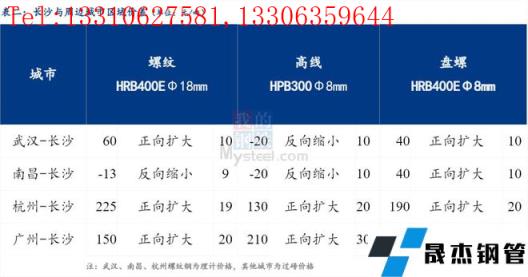 統一為理計單位后,武漢高于長沙60元/噸,南昌低于長沙13元/噸,杭州高于長沙225元/噸,廣州高于長沙150元/噸。