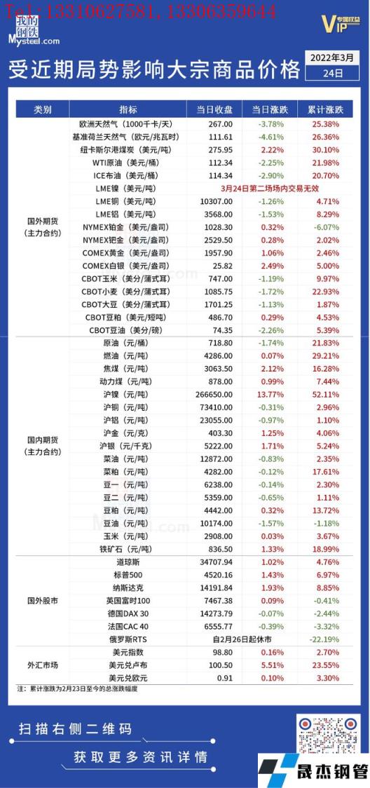 近期,受國際局勢影響,全球金融及大宗商品市場出現(xiàn)較大波動。3月24日,國際油價、能源價格下跌,倫敦金屬交易所(LME)表示,3月24日鎳的第二場場內交易將被視為受到干擾,該交易期間達成的所有交易將無效。匯總情況如下: