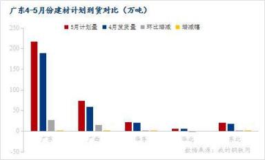2、5月廣東地區建筑材區內(廣東和廣西)計劃供應量共計290萬噸,環比增加7.9萬噸,增幅2.8%;區外計劃供應量為49.1萬噸,環比增加0.2萬噸,增幅0.4%;