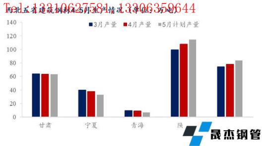 陜西區域:5月陜西主要無縫厚壁鋼管廠家建筑厚壁無縫鋼管總產量114.7萬噸,其中螺紋鋼計劃產量86.8萬噸,較4月增加7.3萬噸;線盤計劃產量27.9萬噸,較4月減少0.1萬噸。
