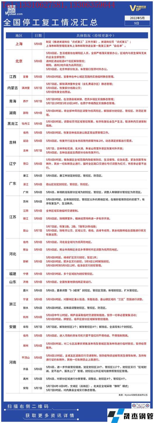 免責聲明:本網站(山東聊城晟杰無縫鋼管廠www.ginginbaby.com)刊載的“疫情影響丨全國停工復工情況匯總(5月9日)”等均源于網絡,版權歸原作者所有,且僅代表原作者觀點,本文所載信息僅供參考。轉載僅為學習與交流之目的,如無意中侵犯您的合法權益,請及時聯系刪除。本網站刊登此篇文章并不意味著本站贊同其觀點或證實其內容的真實性,我們不對其科學性、嚴肅性等作任何形式的保證。如果侵犯了您的版權,請盡快聯系我們予以撤銷,謝謝合作!