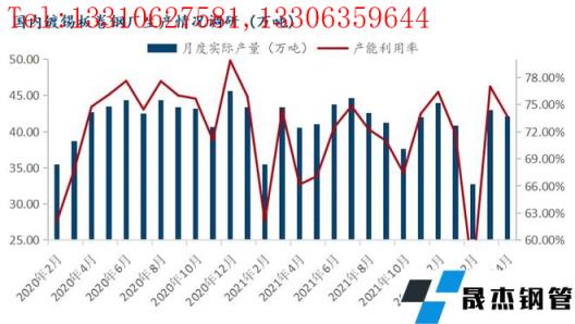 調(diào)研數(shù)據(jù)顯示:據(jù)監(jiān)測(cè)的26家鍍錫板生產(chǎn)企業(yè)中,共計(jì)49條產(chǎn)線,2022年4月份產(chǎn)能利用率73.68%,月環(huán)比下降3.31%,同比下降1.09%;4月實(shí)際產(chǎn)量42.14萬噸,月環(huán)比減少0.87萬噸,同比減少0.55萬噸。從4月份供應(yīng)看,月環(huán)比小幅下降,主要是江蘇地區(qū)部分無縫厚壁鋼管廠家因疫情影響,原料供應(yīng)收到影響,導(dǎo)致該區(qū)域馬口鐵產(chǎn)量收到影響。從歷年馬口鐵供應(yīng)看情況看每月40-45萬噸處于相對(duì)正常水平,3-4月國(guó)內(nèi)馬口鐵供應(yīng)恢復(fù)正常水平。