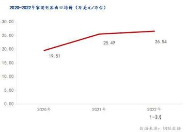2022年一季度中國家用電器出口均價為26.54萬美元/萬臺,2021年一季度家用電器出口均價為25.83萬美元/萬臺。