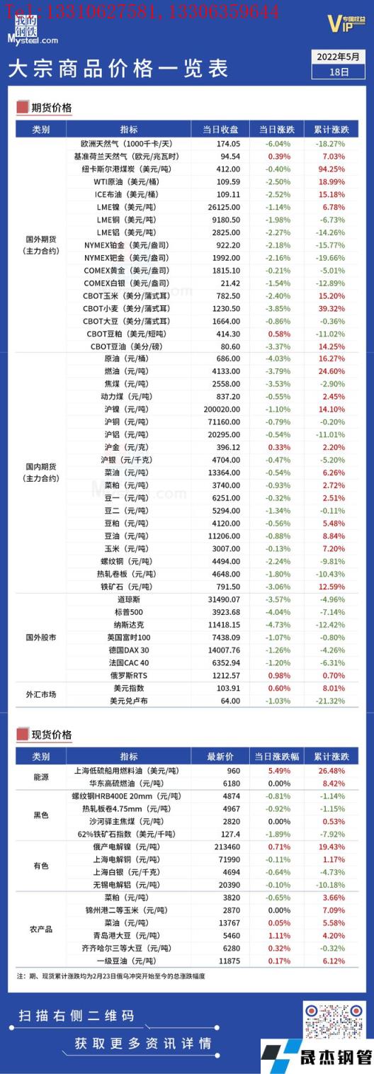 免責聲明:本網站(山東聊城晟杰無縫鋼管廠www.ginginbaby.com)刊載的“俄烏局勢丨大宗商品價格一覽表(5月18日)”等均源于網絡,版權歸原作者所有,且僅代表原作者觀點,本文所載信息僅供參考。轉載僅為學習與交流之目的,如無意中侵犯您的合法權益,請及時聯系刪除。本網站刊登此篇文章并不意味著本站贊同其觀點或證實其內容的真實性,我們不對其科學性、嚴肅性等作任何形式的保證。如果侵犯了您的版權,請盡快聯系我們予以撤銷,謝謝合作!