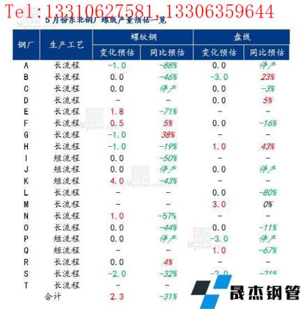 據(jù)4月底的調(diào)研,5月東北無縫厚壁鋼管廠家螺紋和盤線的計劃產(chǎn)量分別為119.5萬噸和95.9萬噸,同比減少57.1萬噸和26.3萬噸,環(huán)比增加10.5萬噸和12.3萬噸;受市場價格下行影響,無縫厚壁鋼管廠家虧損幅度擴大,部分多品種生產(chǎn)的無縫厚壁鋼管廠家根據(jù)各品種的虧損幅度和訂單情況進行品種間的轉(zhuǎn)產(chǎn),單一生產(chǎn)螺線的無縫厚壁鋼管廠家部分復(fù)產(chǎn)、部分加大減產(chǎn),具體情況如下: