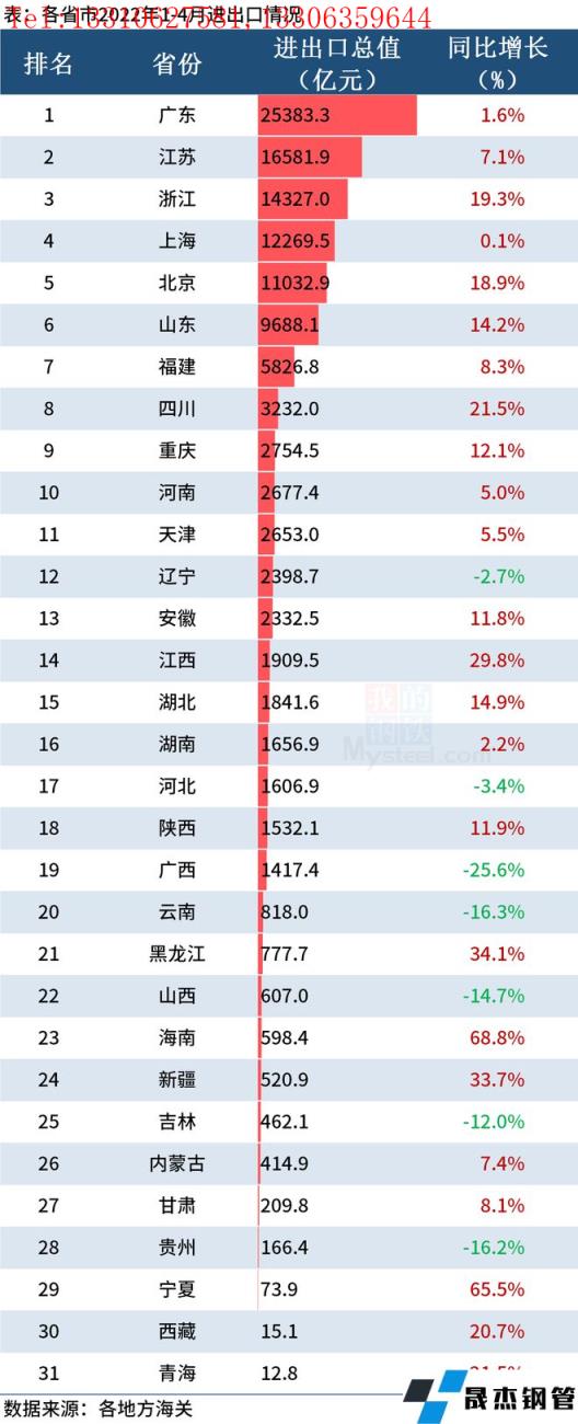 從同比增速來看,24個(gè)省市實(shí)現(xiàn)同比正增長,海南以68.8%的增速位居全國第一;7個(gè)省市實(shí)現(xiàn)負(fù)增長,廣西以-25.6%的增速位居末位。進(jìn)出口總值突破萬億元的5個(gè)省市中,浙江、北京的增速超出全國水平,同比分別增長19.3%、18.9%。具體如下:
