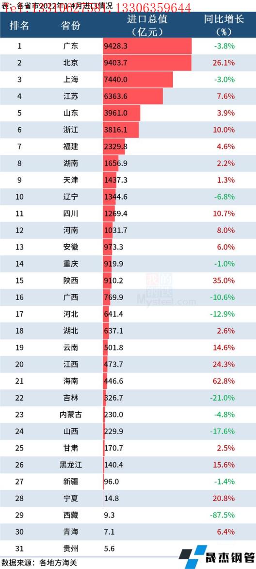 進(jìn)口方面,今年前4個(gè)月,我國進(jìn)口5.61萬億元,同比增長5%。分省市來看,廣東以9428.3億元的數(shù)值排名第一,同比下降3.8%;廣東、北京、上海、江蘇1-4月進(jìn)出口均超5千億元。從同比增速來看,共有20個(gè)省市實(shí)現(xiàn)正增長,其中13個(gè)省市增速超出10.3%的平均水平。海南以62.8%的同比增速位居第一,陜西增長35%排名第二,北京增長26.1%排名第三。此外,共有11個(gè)省市進(jìn)口同比實(shí)現(xiàn)負(fù)增長,分別是重慶、新疆、上海、廣東、內(nèi)蒙古、遼寧、廣西、河北、山西、吉林和西藏,西藏以-87.5%的增速位居末尾。