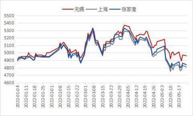 從年初開始,本地市場價格是處于4900元/噸的水平,對比歷年來講這個價格算是偏高的,到2月10號之前基本上處于小幅平穩(wěn)上漲的態(tài)勢,出現(xiàn)了一個小極值在5150元/噸,第二個高點出現(xiàn)在3月8號左右,價格處于5350元/噸左右,此時周邊市場開始受到疫情管控的影響,資源運輸不暢,倉庫提貨困難,市場價格開始大幅下行,到三月中旬總共下跌了300元/噸,下半月市場需求情況受傳統(tǒng)旺季提振有一定恢復,到3月底四月初達到了第三個高點5370元/噸的水平,也是目前為止的最高點,和去年上半年高點相比大幅下降。從4月初一直到現(xiàn)在,中間雖然有階段性反彈,但是價格趨勢整體呈現(xiàn)震蕩下跌的態(tài)勢,目前處于4890元/噸的水平,基本上平了2022年年初的水平。