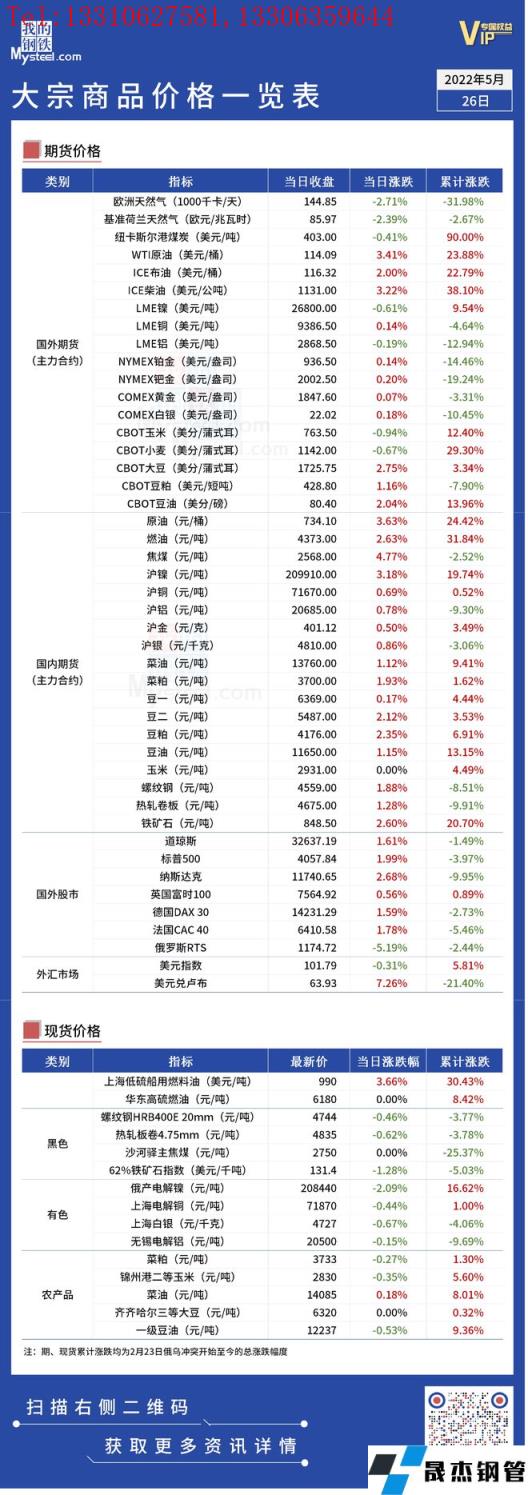免責聲明:本網站(山東聊城晟杰無縫鋼管廠www.ginginbaby.com)刊載的“俄烏局勢丨大宗商品價格一覽表(5月26日)”等均源于網絡,版權歸原作者所有,且僅代表原作者觀點,本文所載信息僅供參考。轉載僅為學習與交流之目的,如無意中侵犯您的合法權益,請及時聯系刪除。本網站刊登此篇文章并不意味著本站贊同其觀點或證實其內容的真實性,我們不對其科學性、嚴肅性等作任何形式的保證。如果侵犯了您的版權,請盡快聯系我們予以撤銷,謝謝合作!