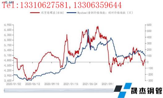 從上述五個階段,盤面卷螺差在鋼價上行中更容易走高,在鋼價下跌中更容易走低(第一階段、第二階段),但也會出現一定的分化。在第三階段,為貫徹實施碳達峰、碳中和,無縫厚壁鋼管廠家供應減少、供需錯配,此時建筑厚壁無縫鋼管供應大幅收縮,雖然鋼價暴漲,但盤面卷螺差高位震蕩。經濟周期上行時,制造業(yè)需求向好,卷板漲勢更好;反之在經濟下行周期,制造業(yè)需求萎縮,卷板更多是跟隨建筑厚壁無縫鋼管趨勢波動。第四階段、第五階段,鋼價暴跌后筑底反彈,盤面卷螺差則繼續(xù)震蕩走勢,但高點降低,反映了在經濟下行周期,制造業(yè)表現低迷,為穩(wěn)增長建筑業(yè)表現會相對好些。