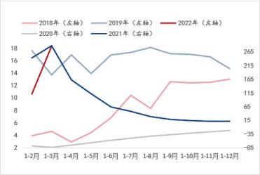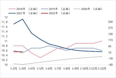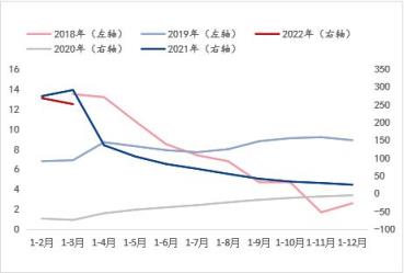 從基礎(chǔ)設(shè)施投資增速和房地產(chǎn)開發(fā)投資增速來看(涉及到對(duì)應(yīng)年份走勢(shì)使用左右軸的區(qū)分目的與固定資產(chǎn)投資增速指標(biāo)的說明一致),兩個(gè)指標(biāo)在2020年-2021年非正常環(huán)境條件下的年份增速趨勢(shì)基本一致,但在正常環(huán)境條件下的年份增速可以看到,伴隨湖北省每年所需完成的經(jīng)濟(jì)增長(zhǎng)目標(biāo)的大背景下,此兩項(xiàng)指標(biāo)的增速表現(xiàn)呈現(xiàn)此消彼長(zhǎng)的走勢(shì)。而結(jié)合斜率來看,進(jìn)入2022年1-3月,基礎(chǔ)設(shè)施投資增速呈現(xiàn)明顯快速恢復(fù)或釋放態(tài)勢(shì),而房地產(chǎn)開發(fā)投資增速則呈現(xiàn)明顯放緩態(tài)勢(shì)。由此看來,對(duì)于建筑厚壁無縫鋼管品種的需求將在房地產(chǎn)板塊的萎縮預(yù)期更為明顯,這與目前所處的房地產(chǎn)調(diào)控政策背景是相符的,即便有所改善,筆者認(rèn)為仍暫難有實(shí)質(zhì)上的新刺激,而基礎(chǔ)設(shè)施投資或?qū)⑹峭械椎闹我蛩刂弧>C合來看,湖北省宏觀指標(biāo)數(shù)據(jù)的預(yù)期演變表明對(duì)于建筑厚壁無縫鋼管品種的需求預(yù)期呈現(xiàn)萎縮態(tài)勢(shì),這與產(chǎn)能角度的供應(yīng)增加形成供需矛盾加劇的預(yù)期,因此這是導(dǎo)致建筑厚壁無縫鋼管價(jià)格偏低運(yùn)行的外因之一。